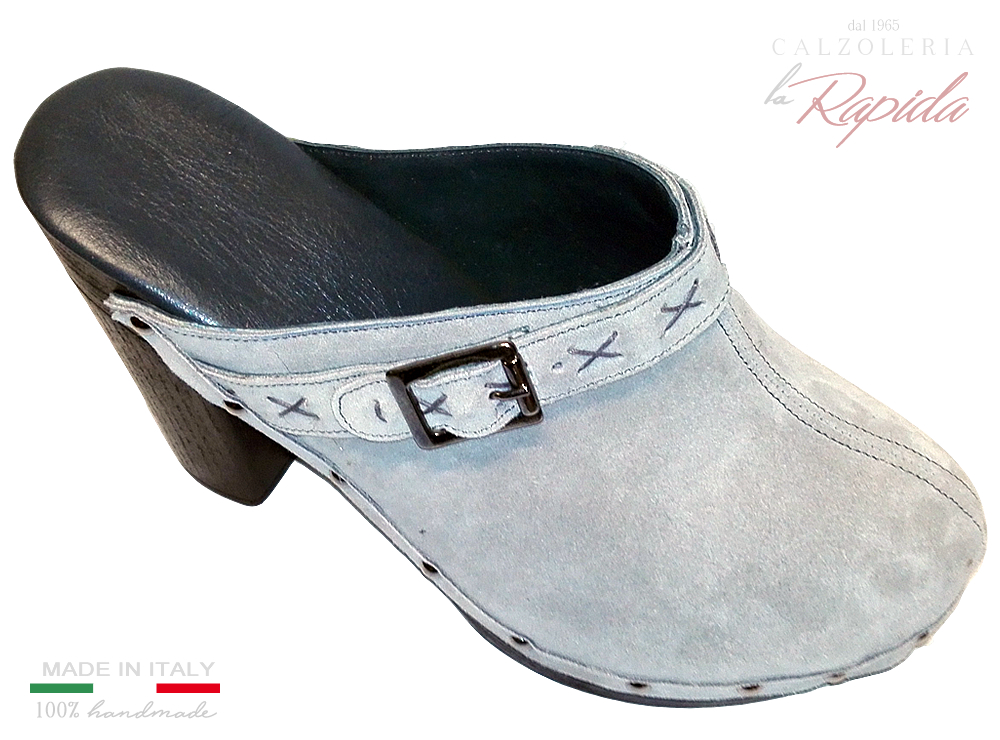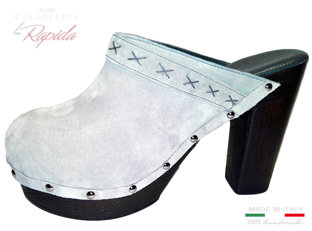 Materiale: Sabot in legno verniciato nero, tomaia in pelle grigia scamosciata.