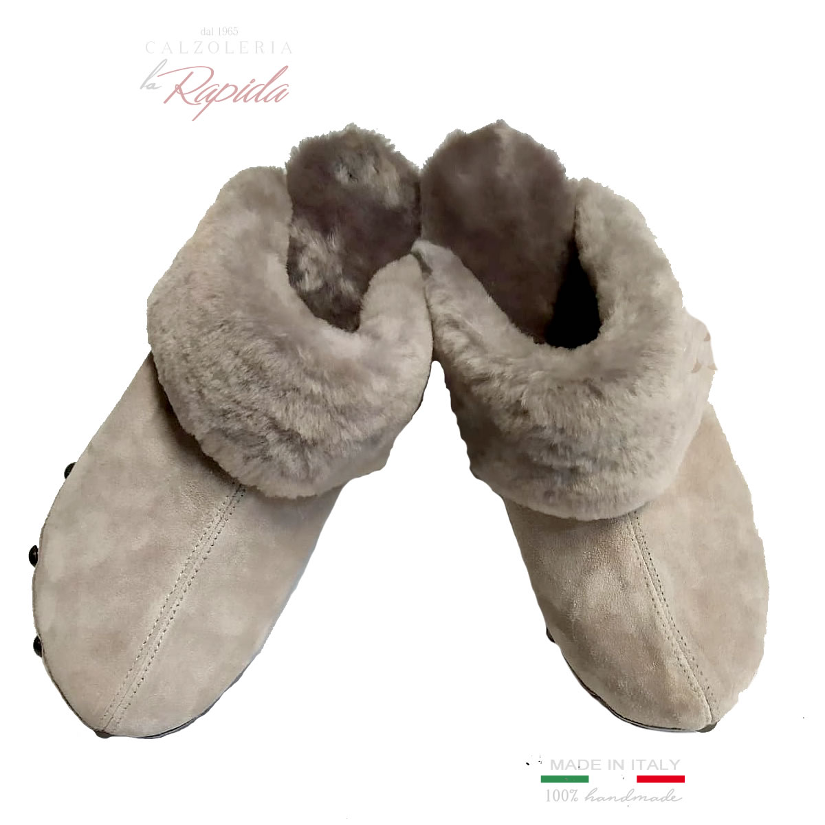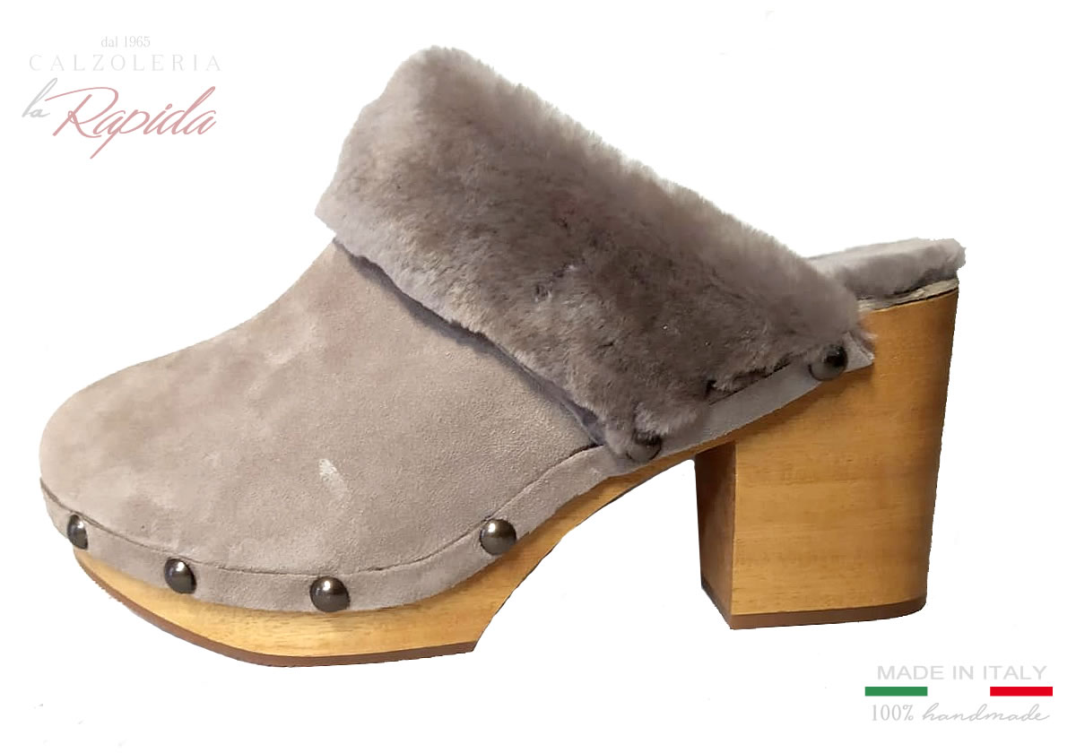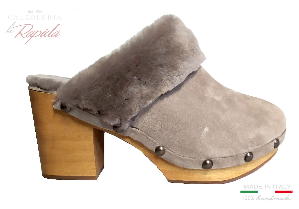 Descrizione: Bellissimi sabot donna in legno di camoscio color tortora, con risvolta e fodera in shearling vero per un autunno inverno 2024 caldo e alla moda.