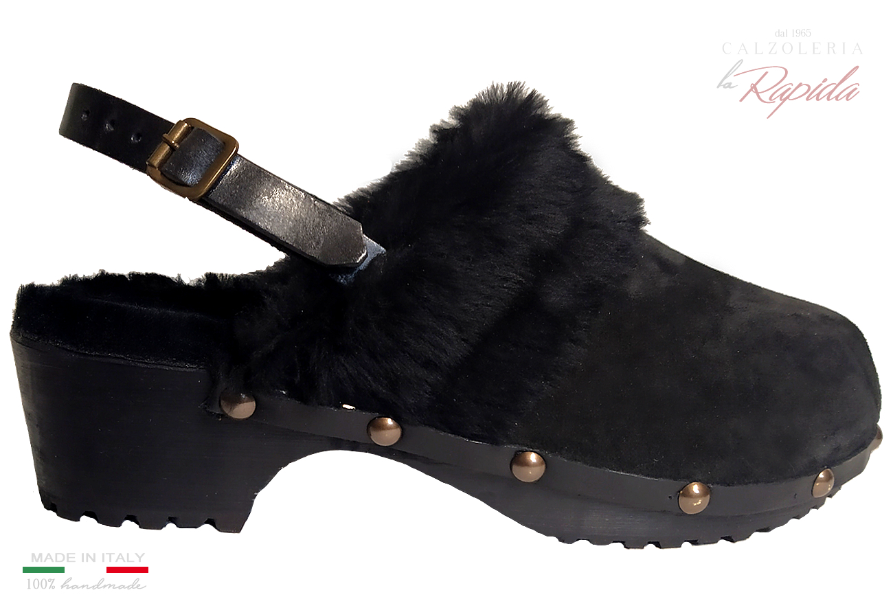 Materiale: Sabot donna in legno con calda pelliccia, in autentica pelle camoscio nera. Borchie decorative e laccio a sandalo.