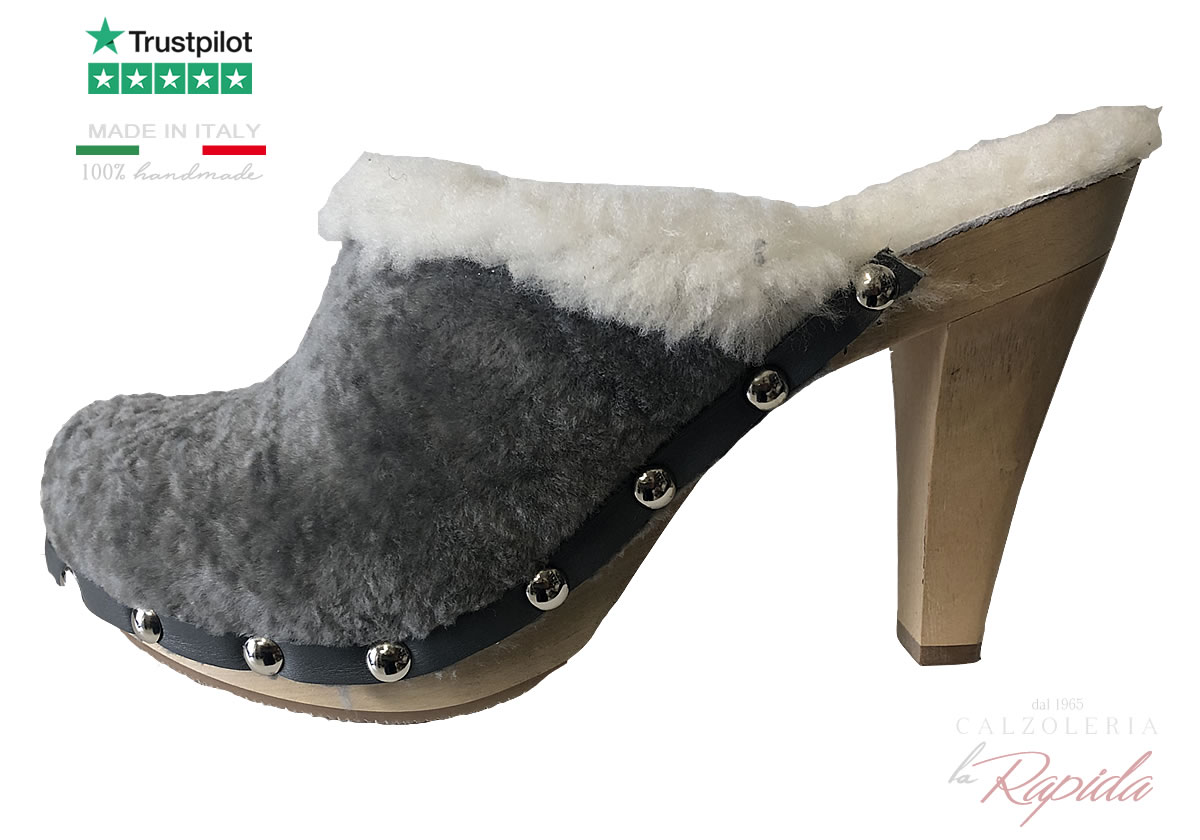 Materiali: Tomaia Astrakan sintetico, fodera e soletto shearling vero, suola legno.
