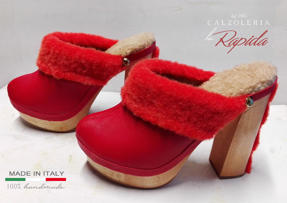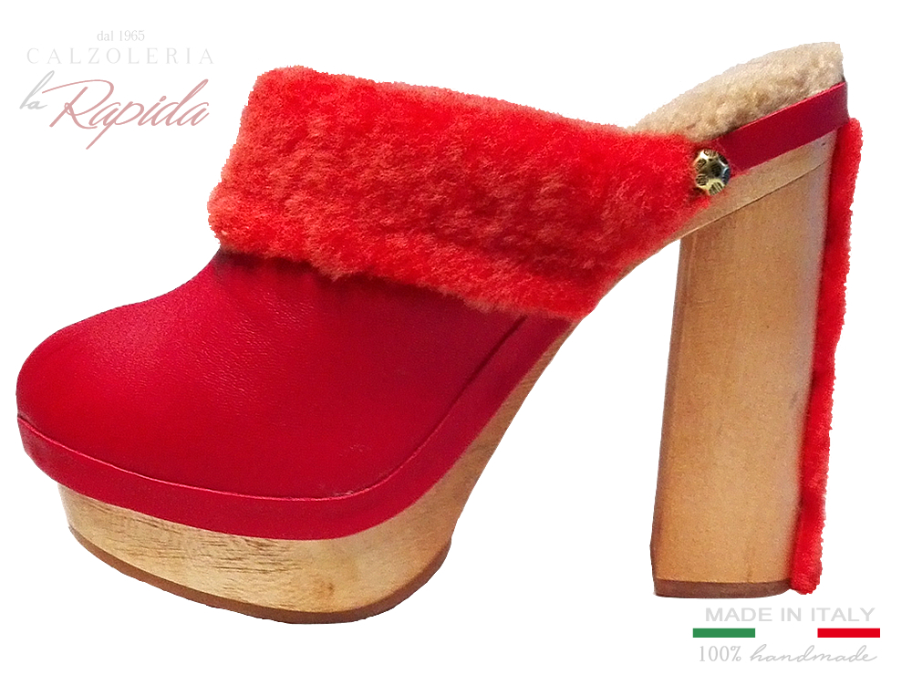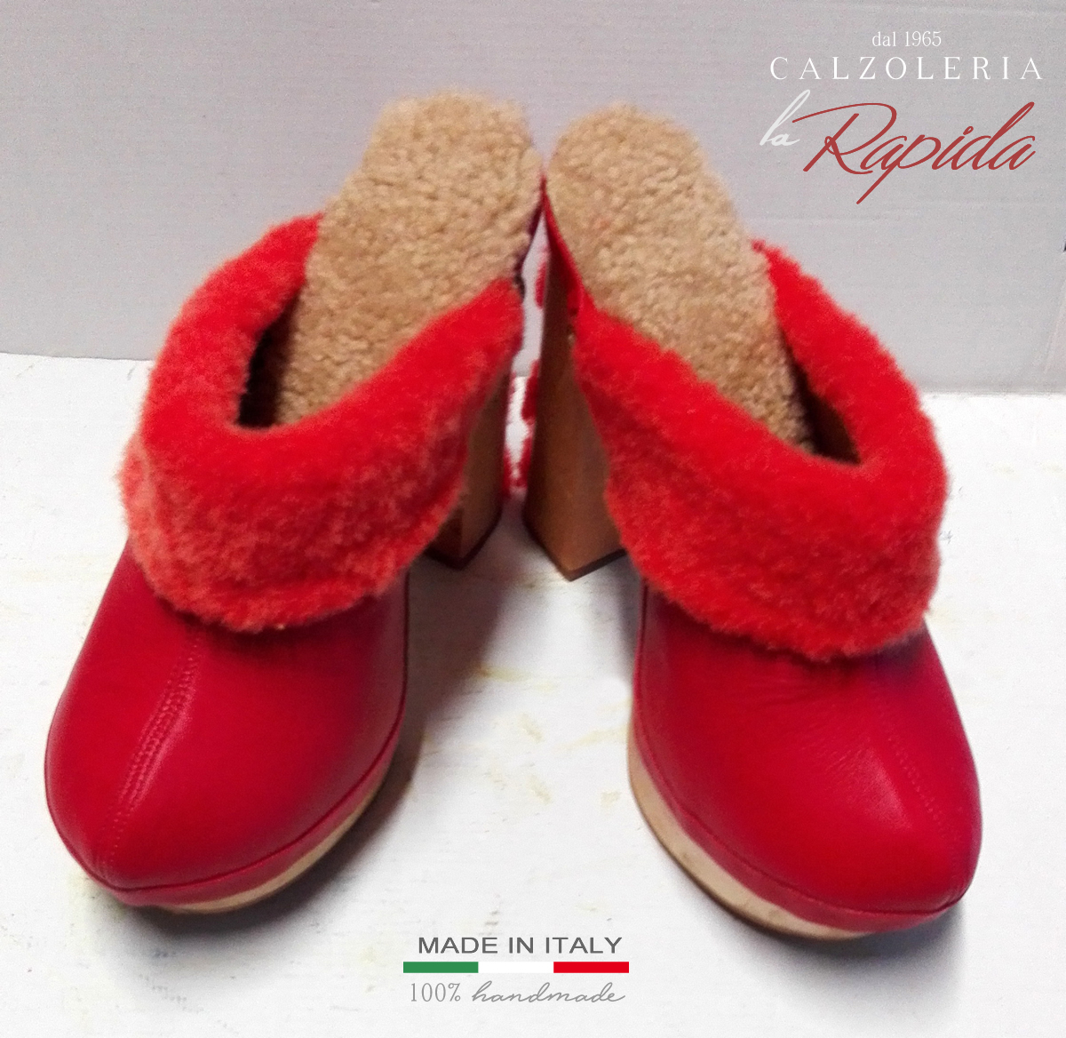 Materiale: Sabot donna in pelle rossa, con calda pelliccia beige in montone naturale. Graziosa e stilosa striscia in pellicciotto rosso sul tacco in legno. Possibilità di personalizzazione.