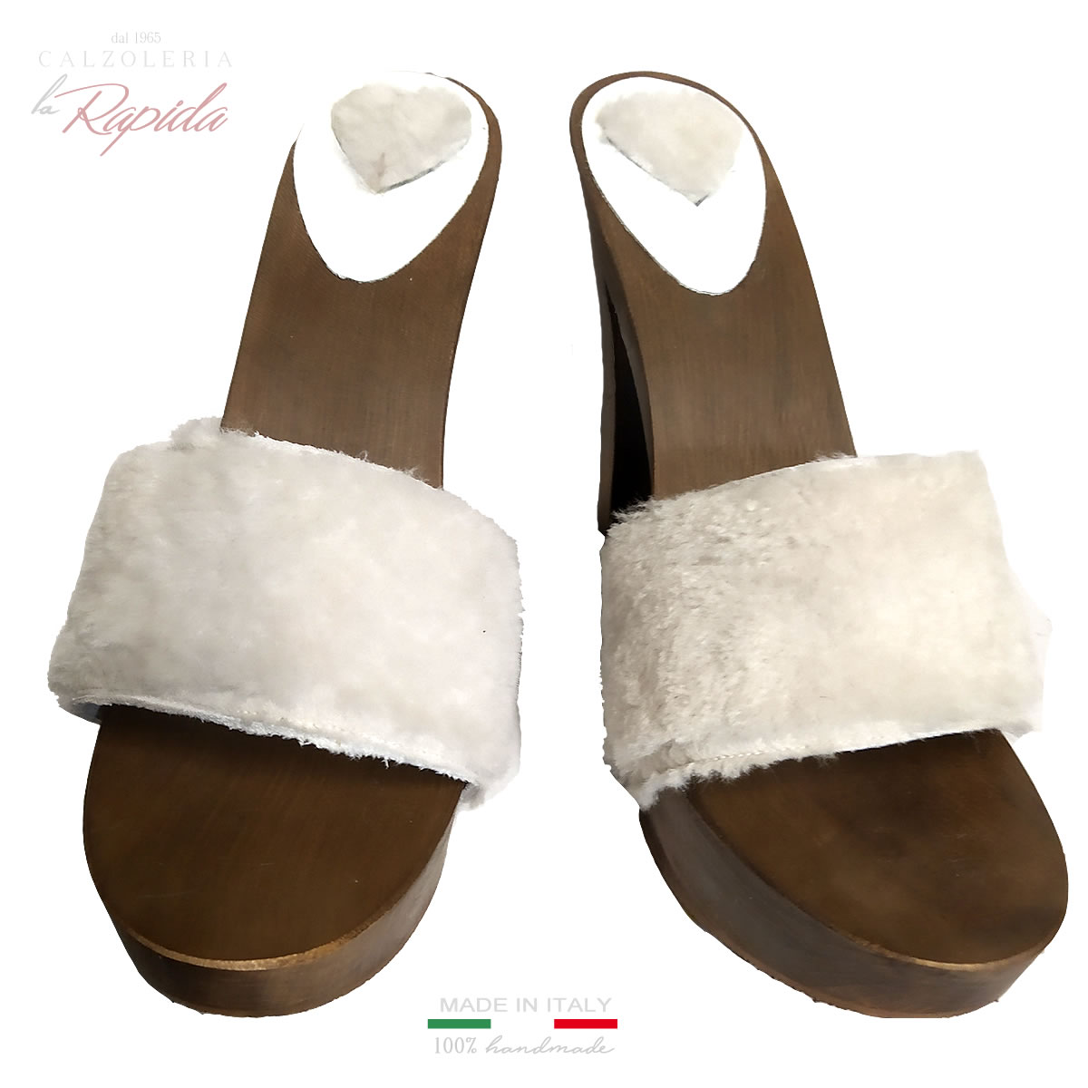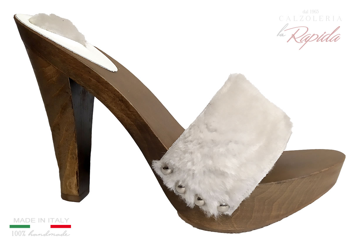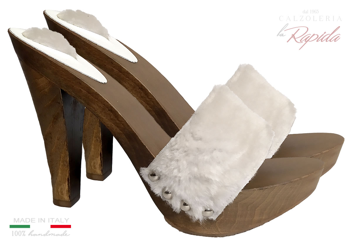 Materiale: fascia in pelle rivestita di pelliccia ecologica bianca avorio / panna, molto morbida e calda, tacco in legno verniciato spazzolato con trattamento cerato.