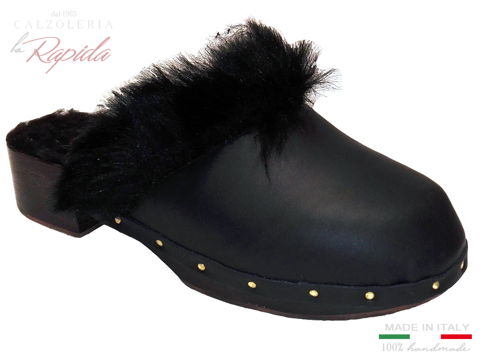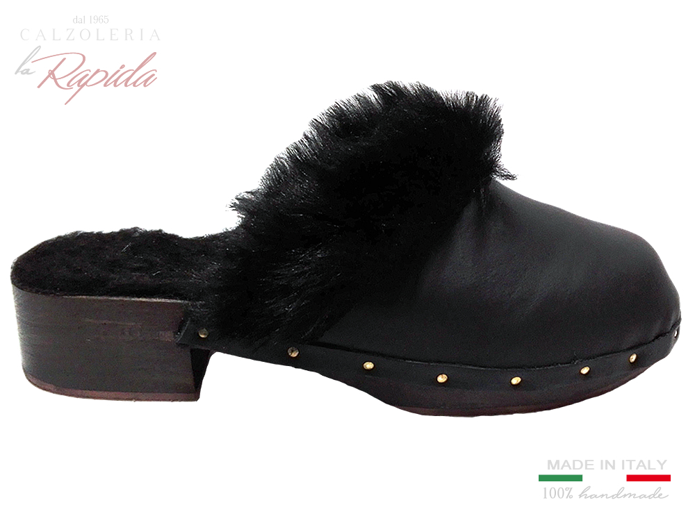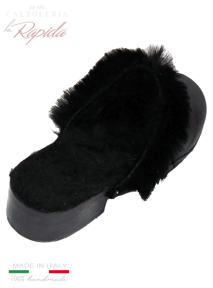 Materiale: zoccolo in legno tomaia in pelle color nero, imbottitura pelo simil montone