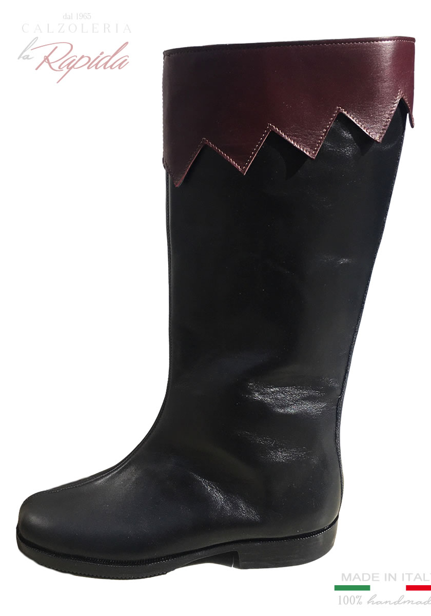 Descrizione: bellissimi stivali medievali con lacci esterni, e orlatura bordeaux, in pelle neri, realizzati a mano.