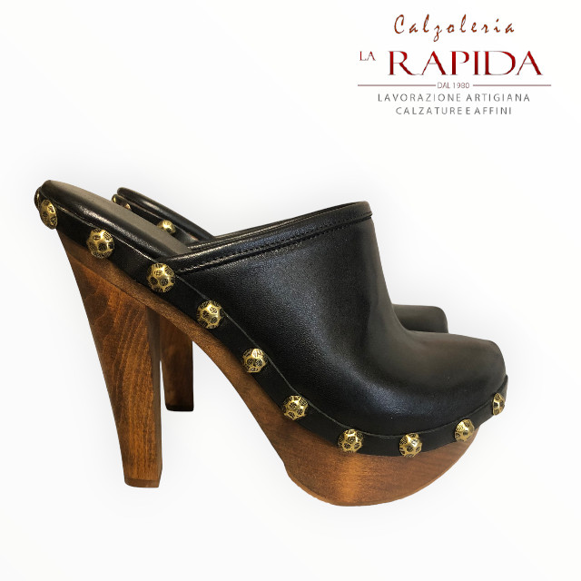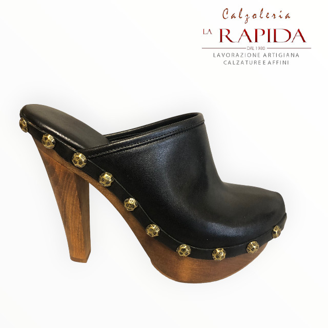 Sabot con Tacco Altissimo in Pelle Nera lucida con Borchie Ornamentali Martellate