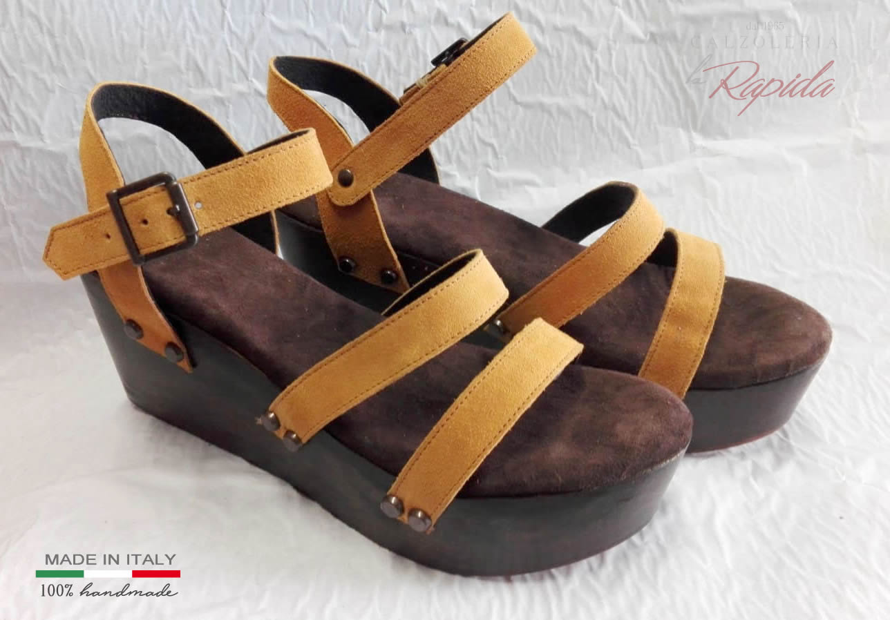 Materiale: Sandali donna con zeppa con fasce in pelle color giallo ocra scamosciata. La piant presenta una imbottitura morbida e comoda.