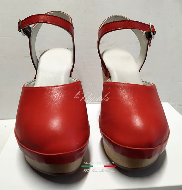 Materiale: Sandali svedesi in legno con tacco, fascia chiusa in pelle e cuoio color rosso. Pianta imbottita morbida in pelle.
