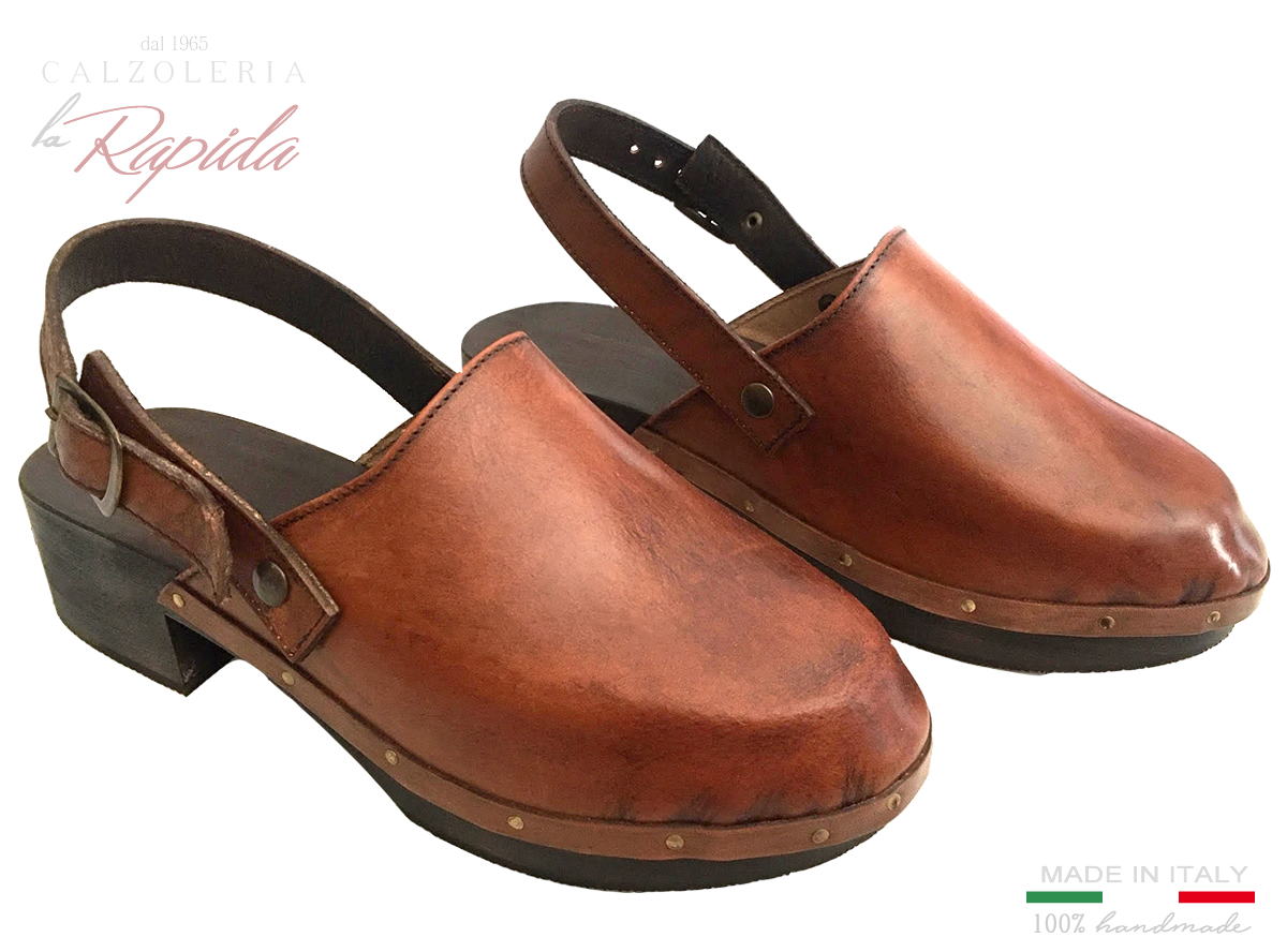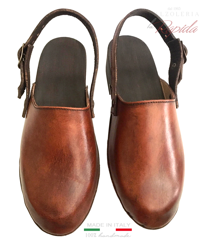 Materiali: Sandali Clogs da Donna con fascia in pelle e cuoio naturale con trattamento vintage retrò. Cinturino in Pelle regolabile, fondo in legno naturale verniciato.