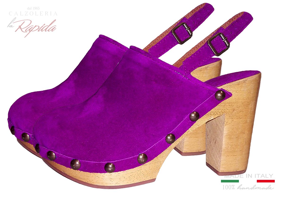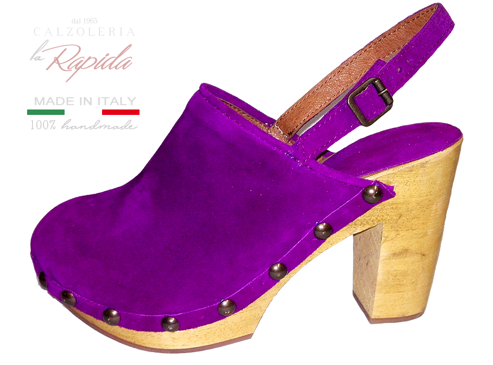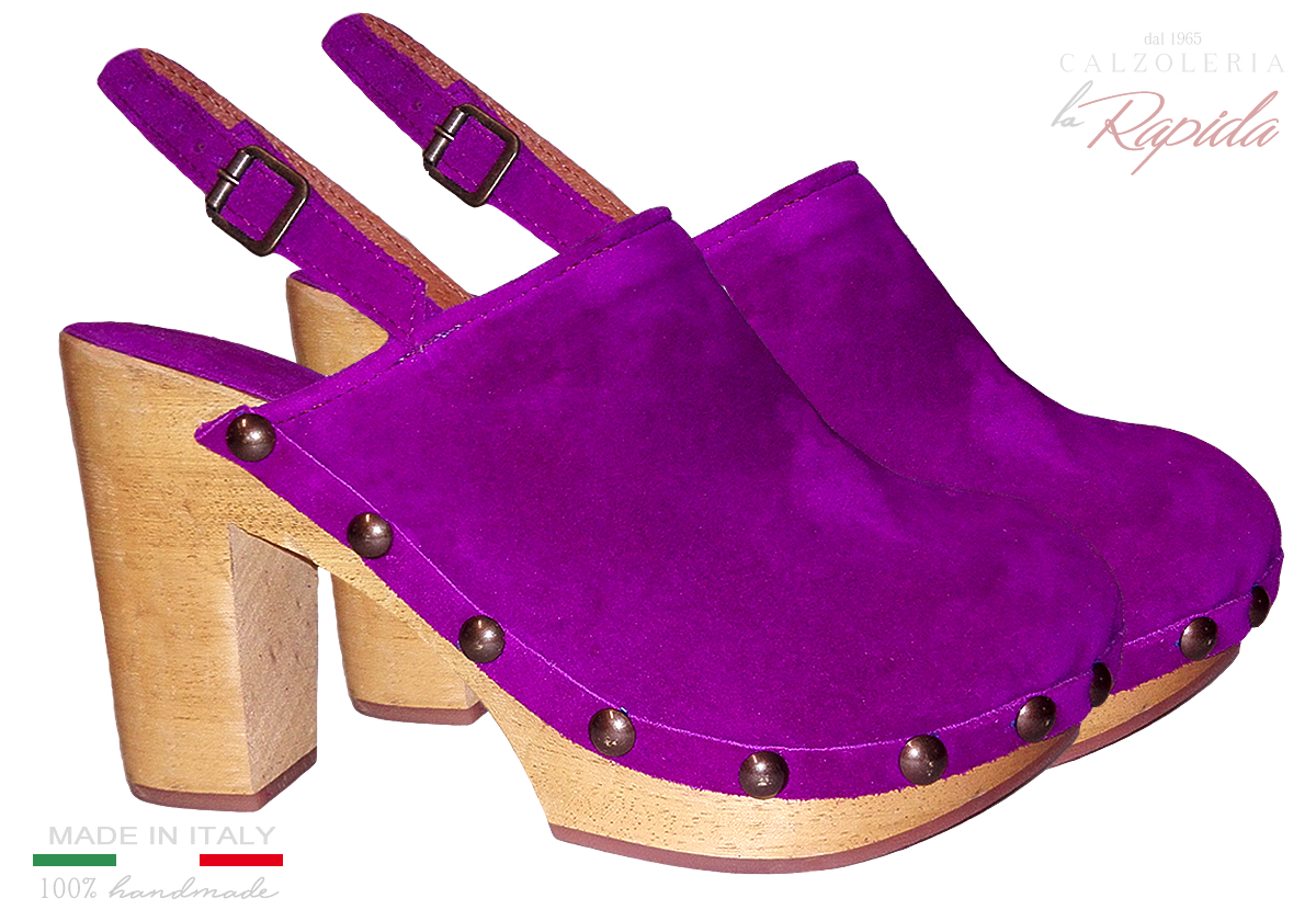 Descrizione: bellissimi ed eleganti sabot mules donna, zoccoli danesi donna in legno artigianali, con fascia chiusa in pelle camoscio viola con laccio.