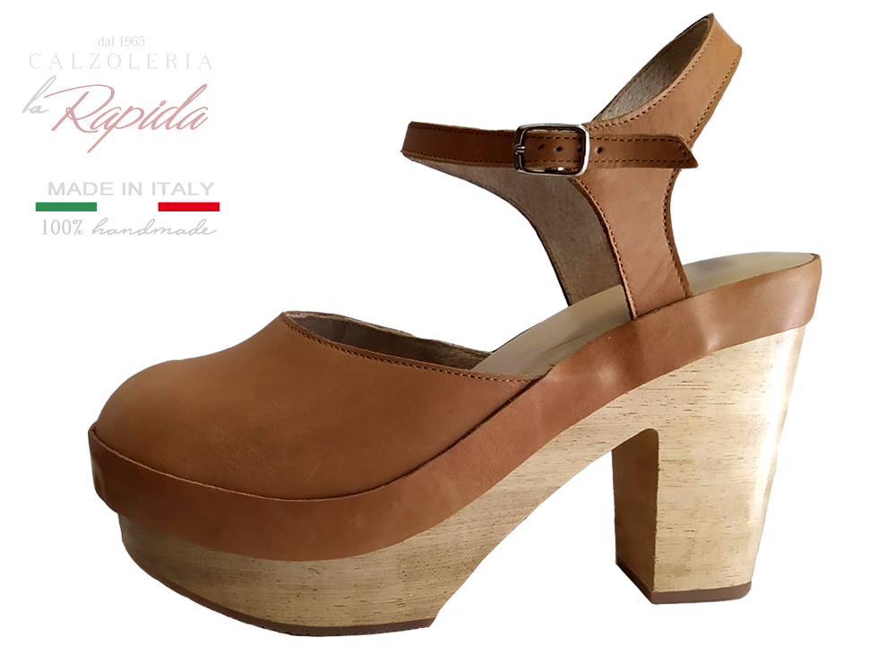 Materiale: Sandali sabot donna con tacco con tomaia in pelle color cammello e cavigliera.