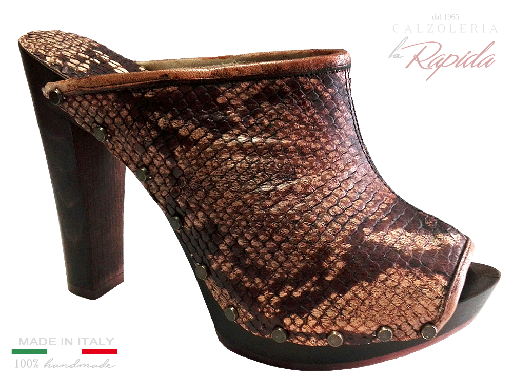 Descrizione: sabot donna in legno, con fascia avvolgente elegante in pelle simil pitone, con apertura sulle dita. Bellissi, comodi ed eleganti.