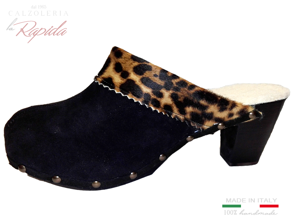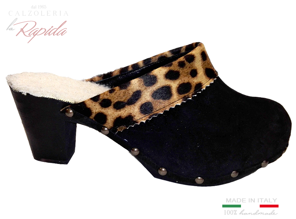 Materiale: zoccoli sabot mules invernali da donna in legno verniciato con fascia in pelle camoscio nera e decorazione maculata
