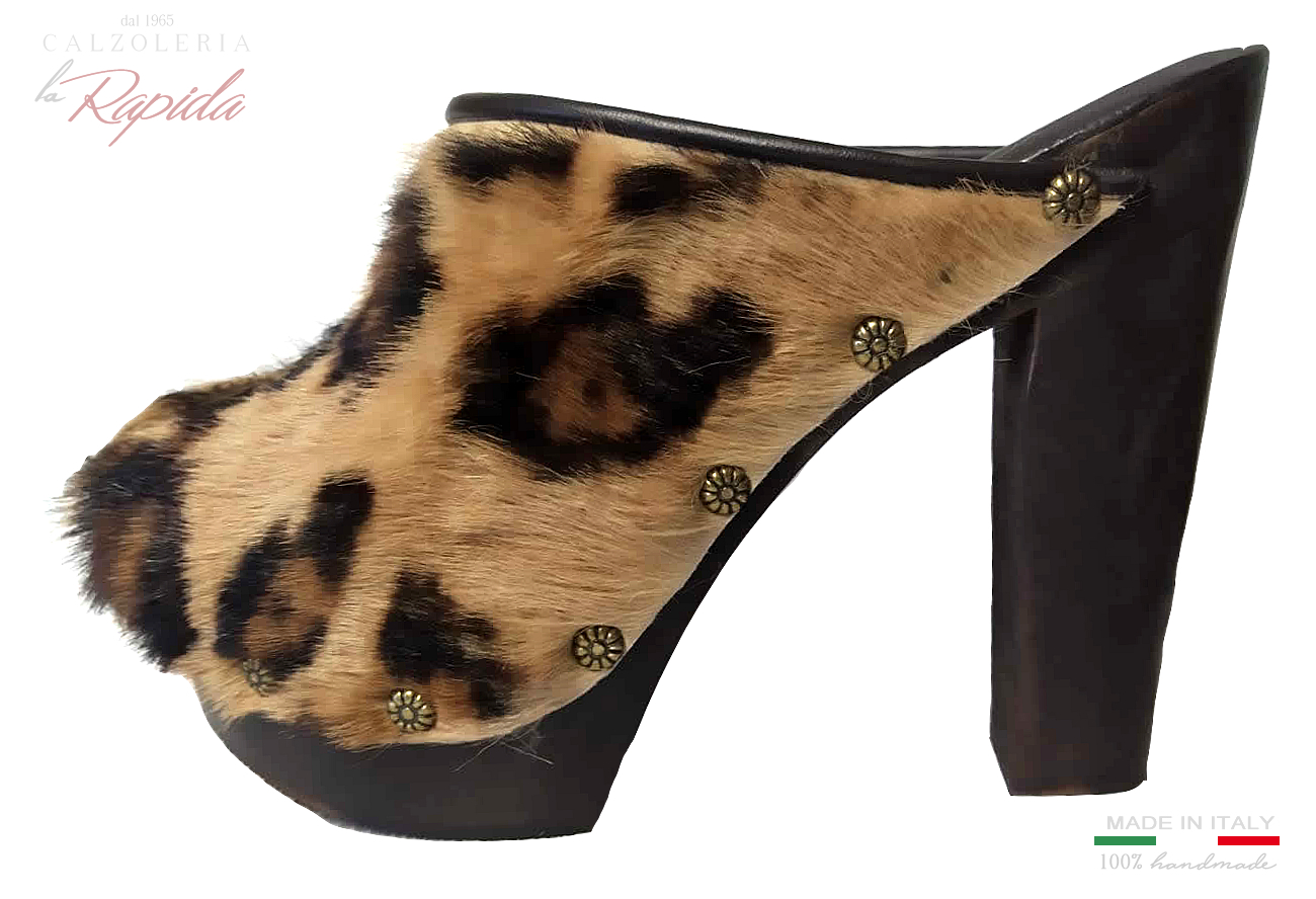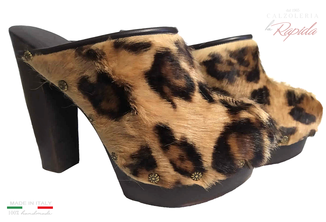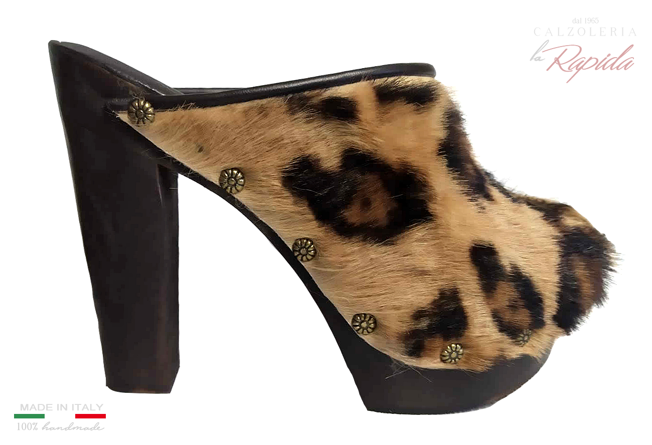 Materiale: SABOT in legno con tomaia pelle cavallino maculata.