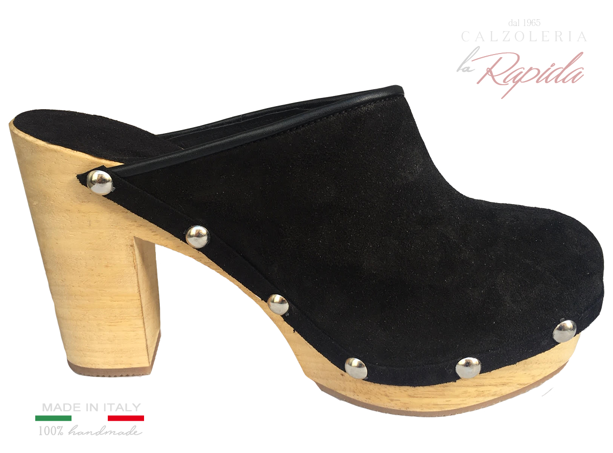 Materiale: zoccolo in legno tomaia pelle nera camoscio. Possibilità di averlo con tomaia con risvolta, e con cucitura a seconda dei gusti. Specificarlo nell'ordine nell'apposito campo note e personalizzazioni.