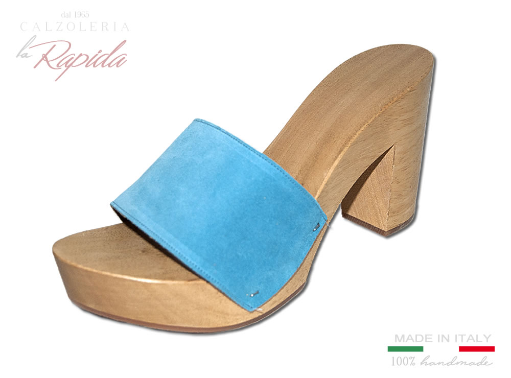 Zoccoli donna mare e uso quotidiano, tacco alto 10 cm, in pelle camoscio celeste.