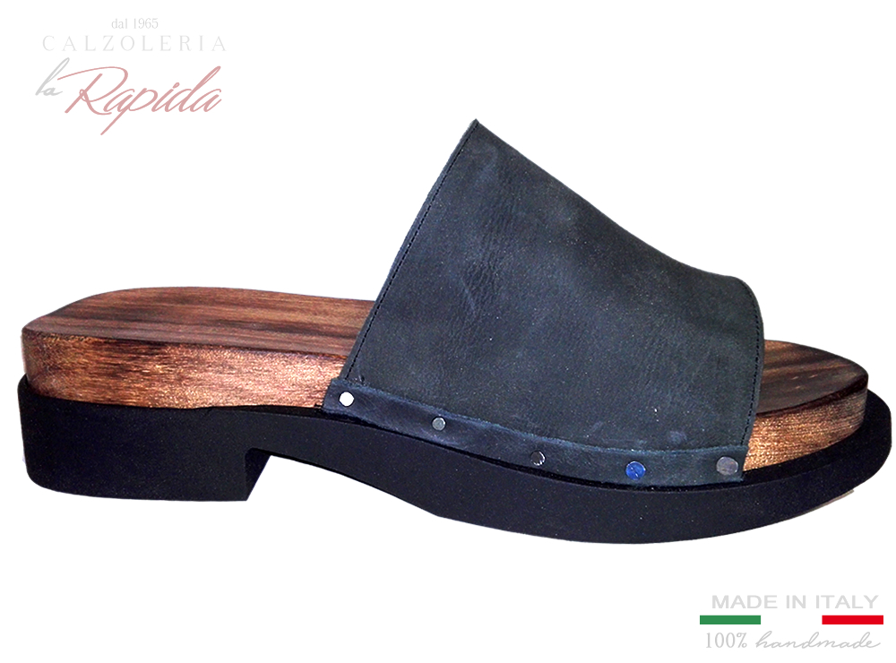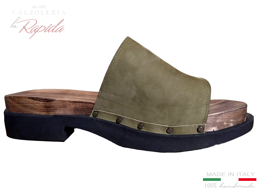 Materiale: tomaia in pelle, color verde militare, fondo in legno con suola in materiale che non reca rumore.