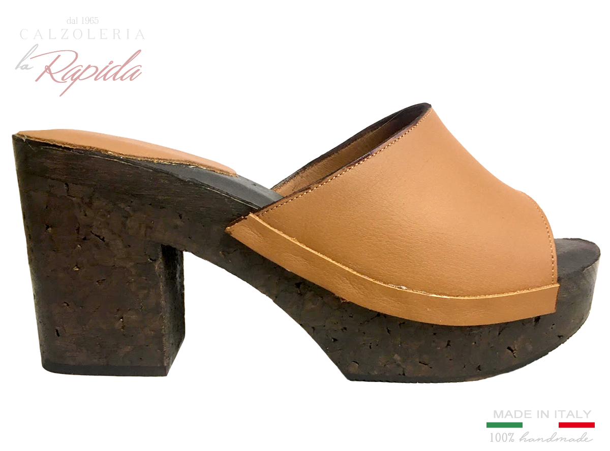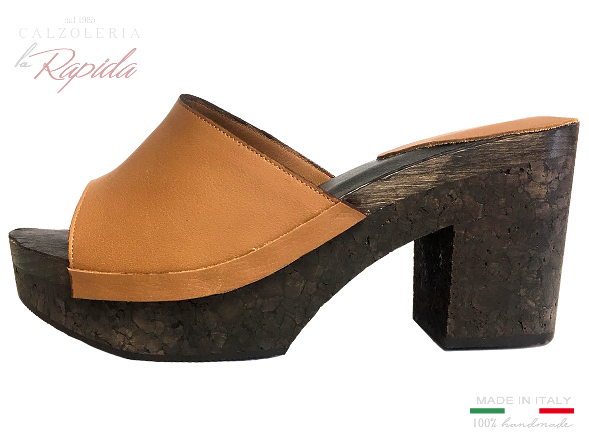 Materiali: tomaia in pelle cuoio naturale, con fondo in sughero verniciato (possibile anche lasciarlo in sughero naturale) con tacco medio.