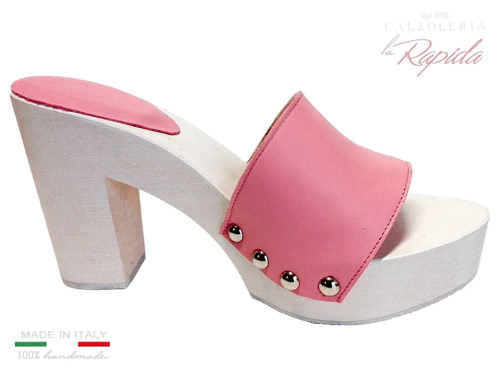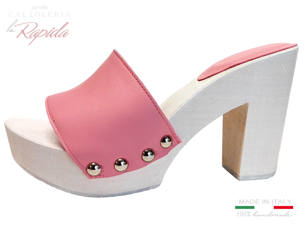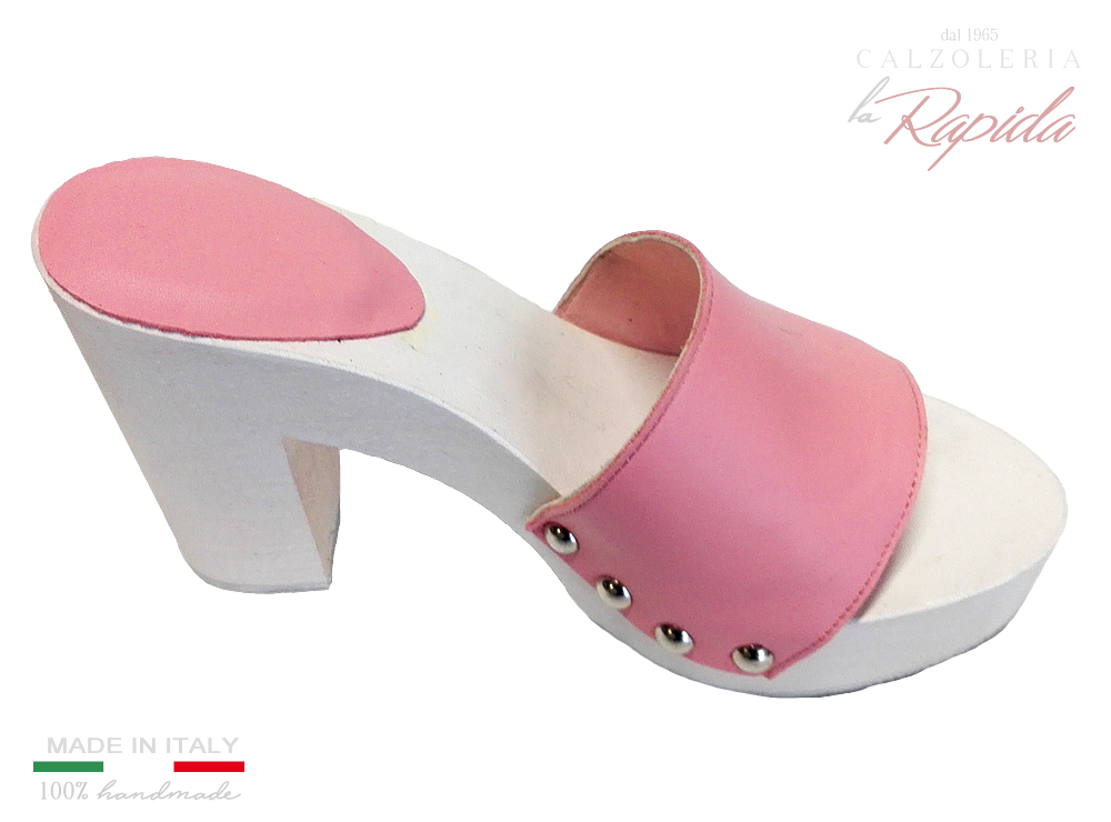 Materiale: legno verniciato di bianco effetto shabby chic, la tomaia è in autentica pelle color rosa confetto. Borchie argentate, con possibilità di personalizzazioni.