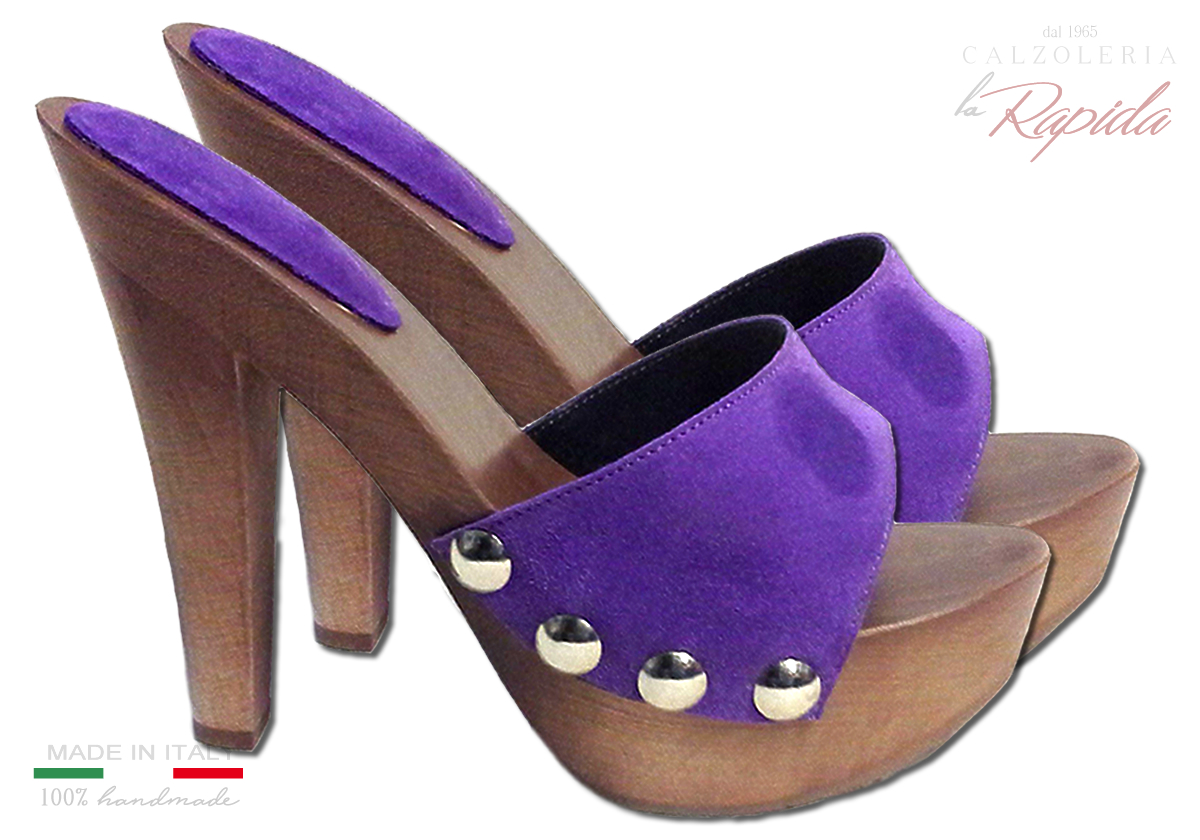 Descrizione: bellissimi ed eleganti zoccoli da donna estate in legno artigianali, con fascia minimal in pelle viola camoscio.