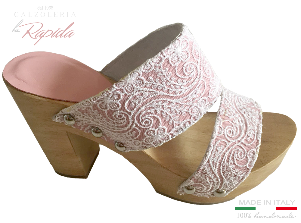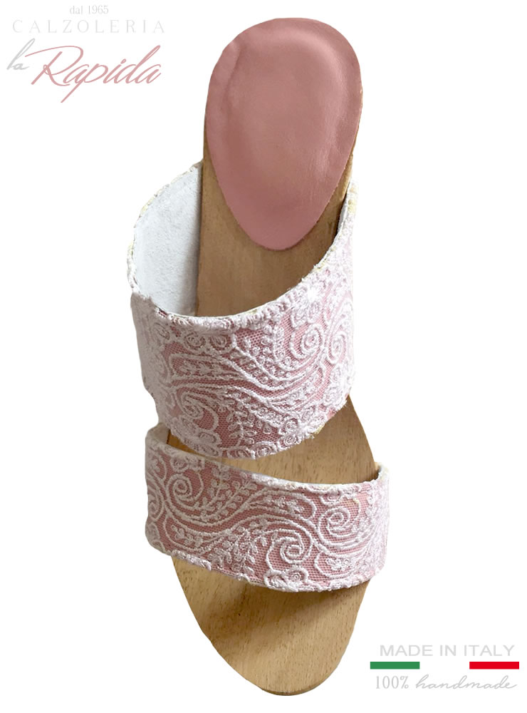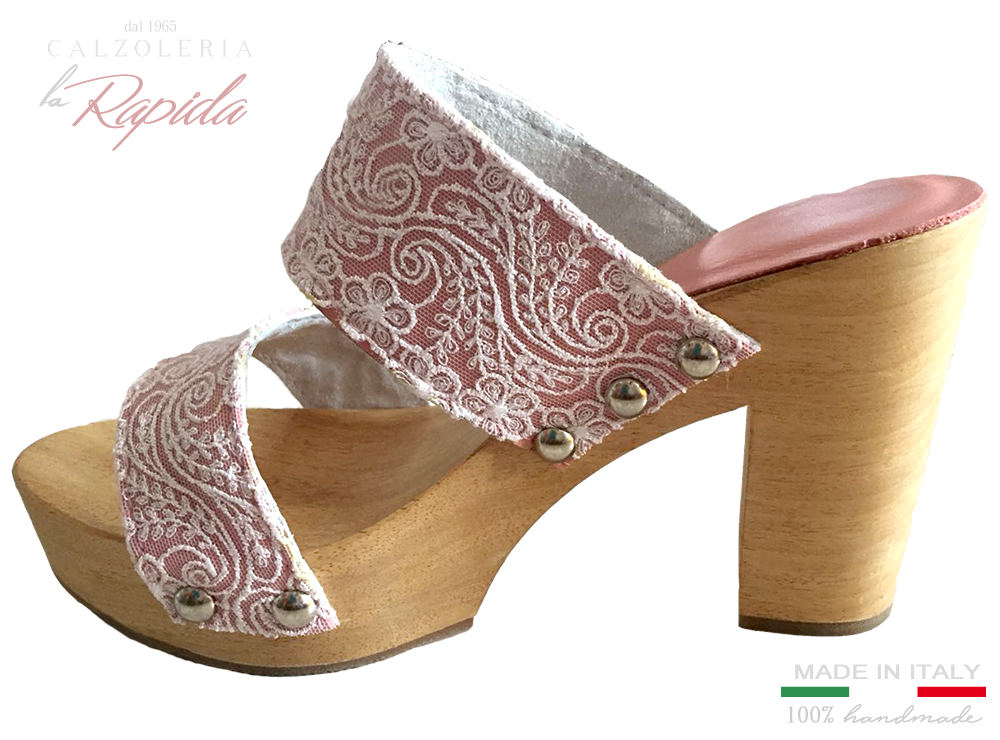 Materiale: Sandali con tacco in legno con doppia tomaia rosa e decorazione in pizzo.
