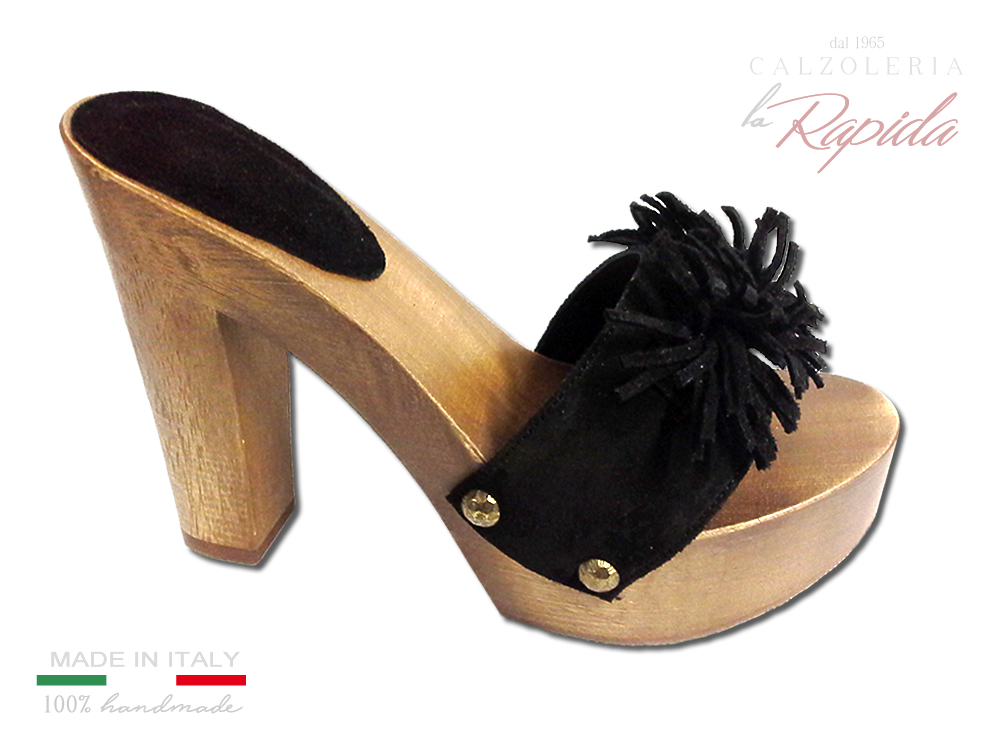 Descrizione: zoccoli glamour estivi pom pom moda 2024 artigianali in legno in pelle camoscio nera.