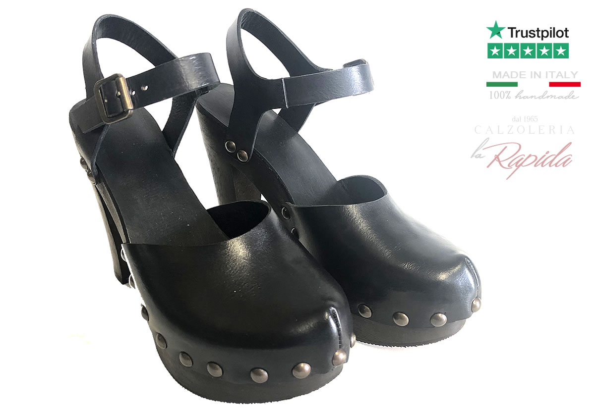 Zoccolo a sabot in pelle con laccio alla caviglia regolabile, ampiamente personalizzabile nei materiali e nei colori.
