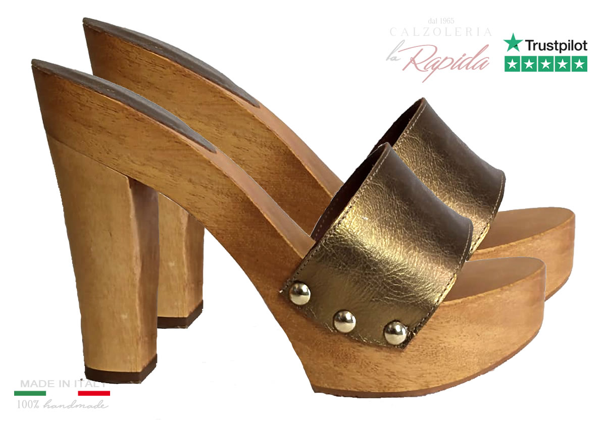 Descrizione: zoccoli in legno clogs tendenza 2024 bellissimi, eleganti in pelle bronzo, donano un tocco di eleganza glamour con uno stile semplice e minimale.