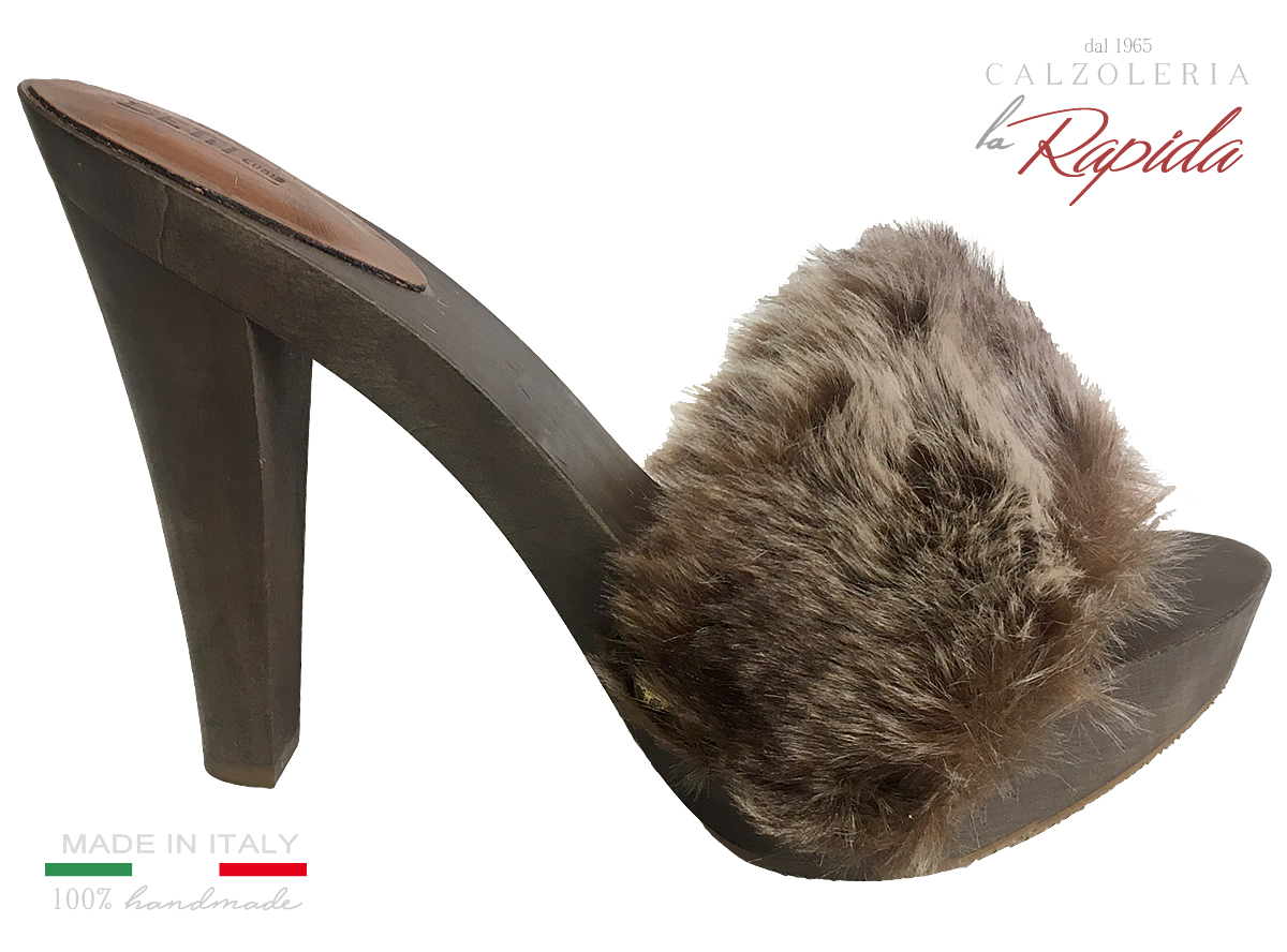 Materiale: fascia in pelle rivestita di pelliccia ecologica simil visone molto morbida e calda, tacco in legno verniciato spazzolato con trattamento cerato.