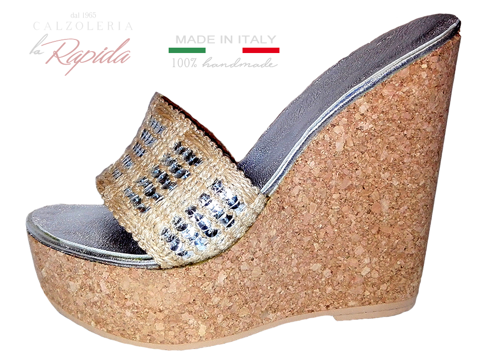 CD38 KATHUSA Materiale: Zeppa donna alta in sughero, rivestimento in pelle con fascia decorata in oro e argento