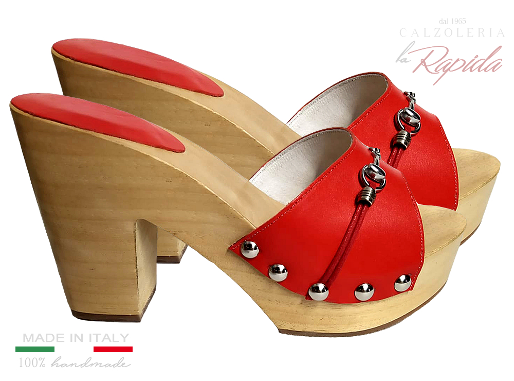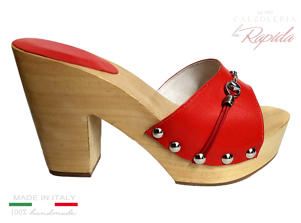 Materiale: zoccolo in legno tomaia in pelle naturale colore rossa, con decorazione elegante di lusso alla moda.