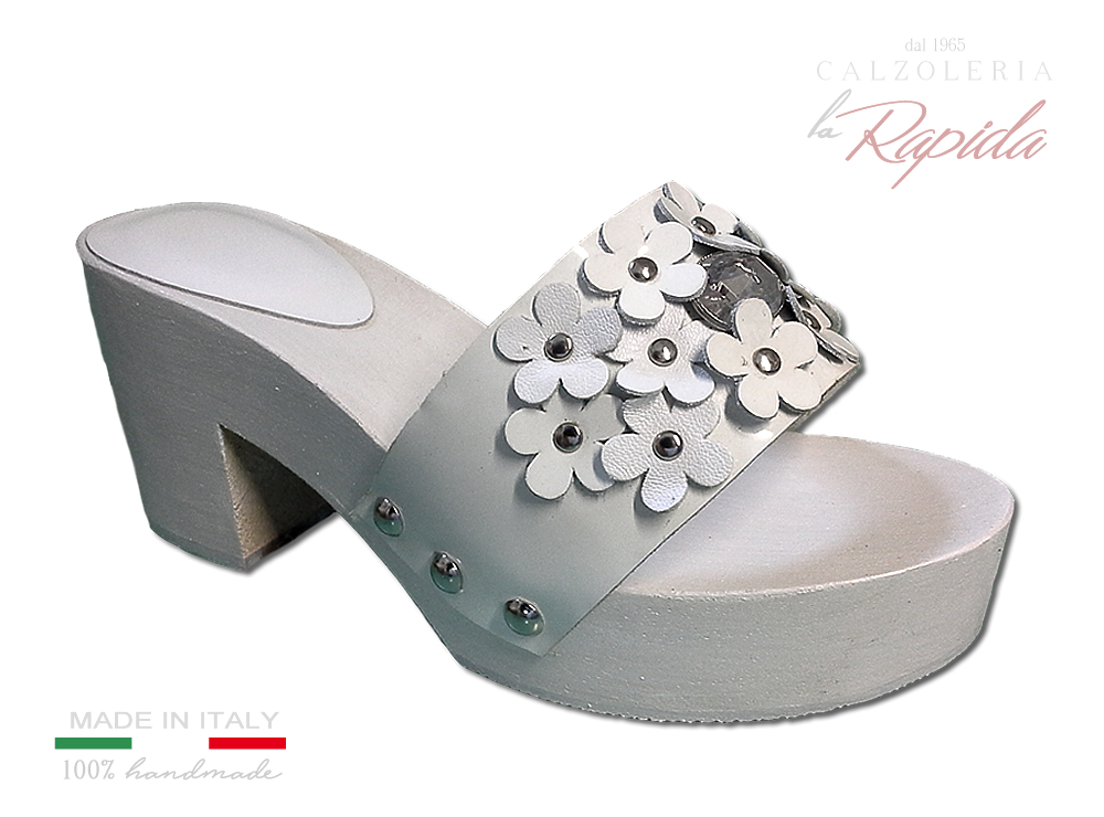 Materiale: pelle bianca con decorazioni floreali e strass centrale. Legno verniciato di bianco. Decorazioni floreali e personalizzabili.