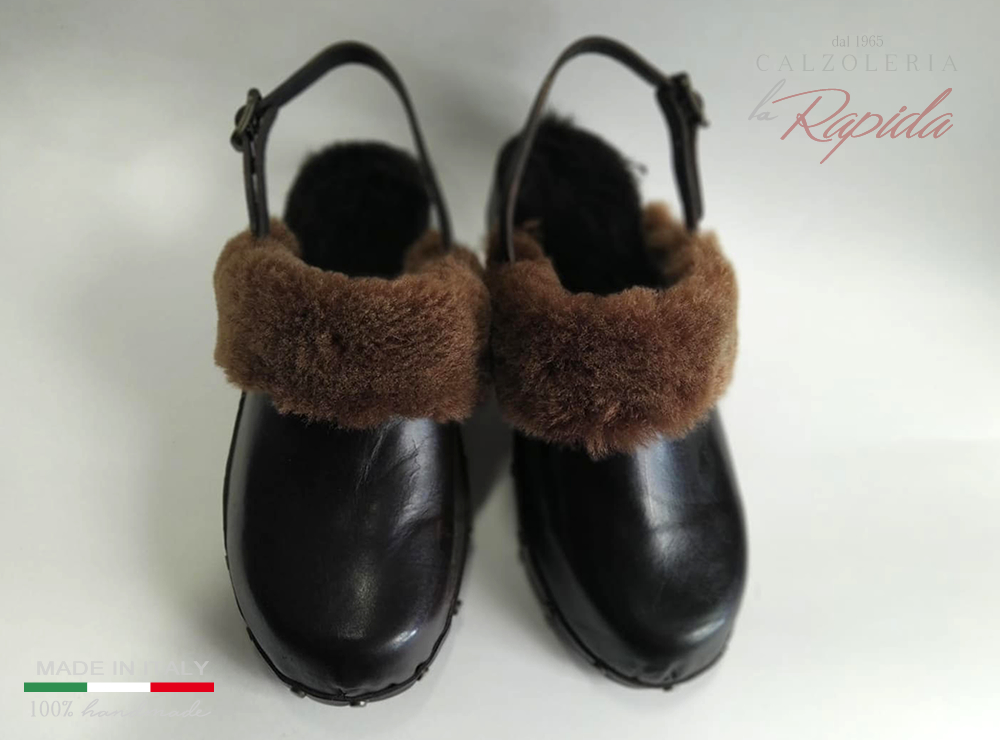 Materiale: Sabot donna in legno con calda pelliccia, in vera pelle nera. Le borchie decorative si possono avere in diversi disegni e colori.