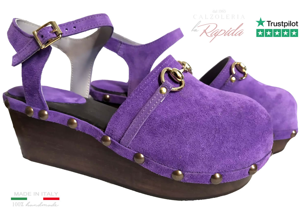 Materiale: zeppa in legno verniciato con pianta imbottita con rivestimento in morbida pelle confortevole, materiali 100% made in italy di alta qualità, tagliati e cuciti a mano. Pelle camoscio viola, realizzabili in altri 20 colori disponibili, il tutto arricchito da una bellissima decorazione glamour in ottone.