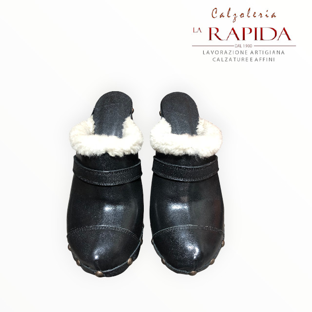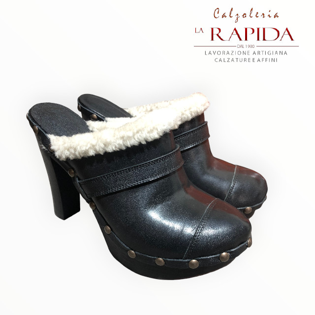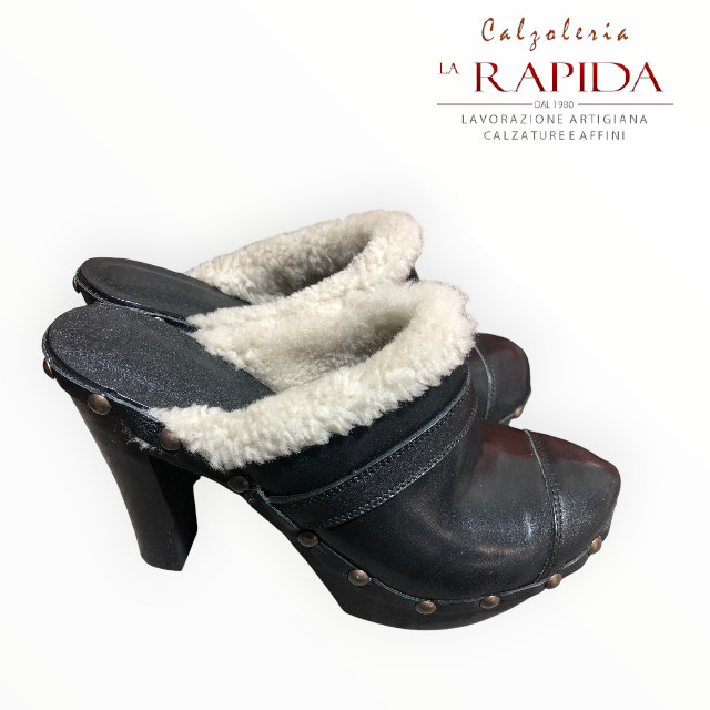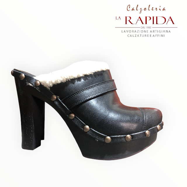 Sabot Con Tacco in pelle Nera Foderato in Vero Shearling Bianco