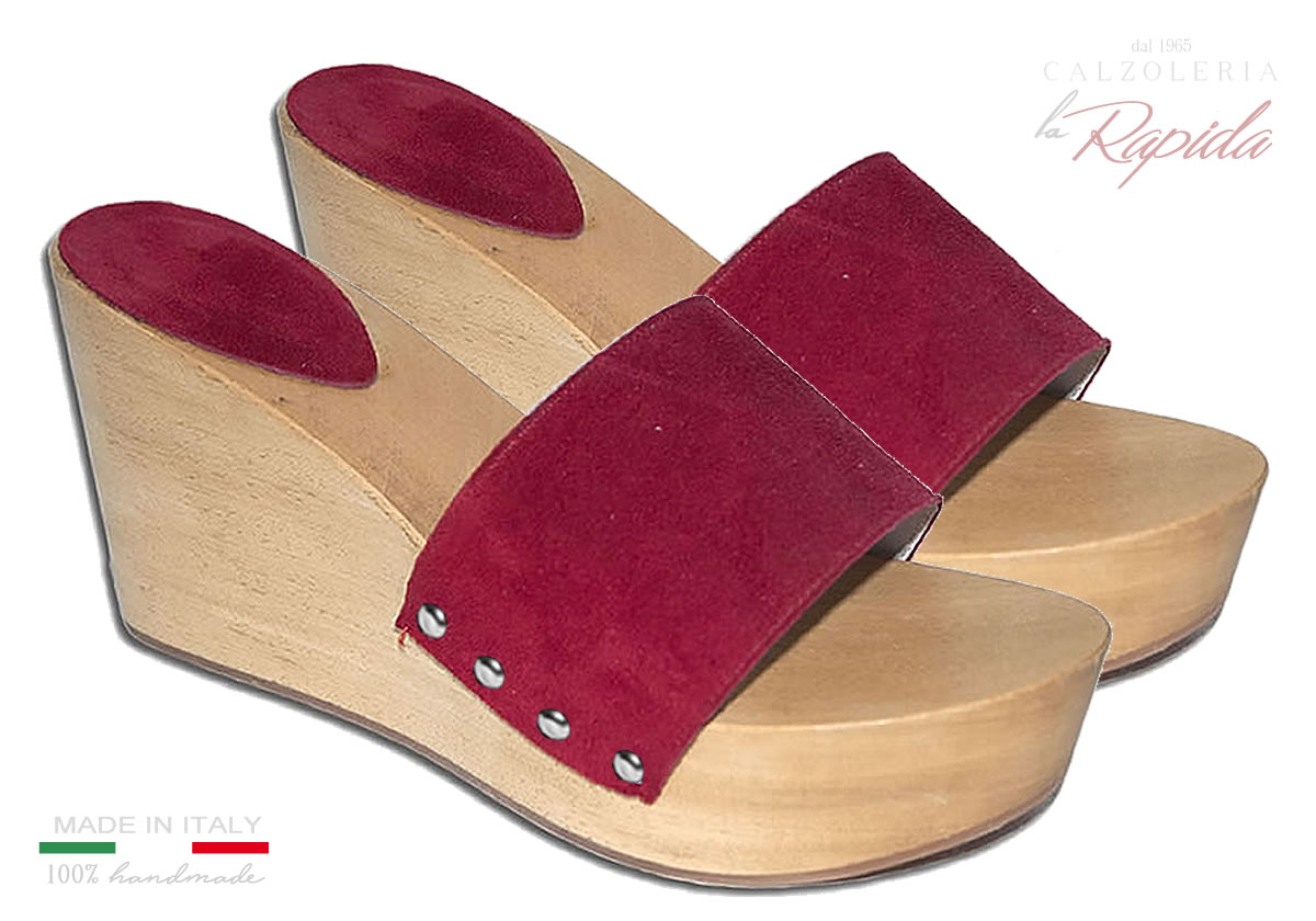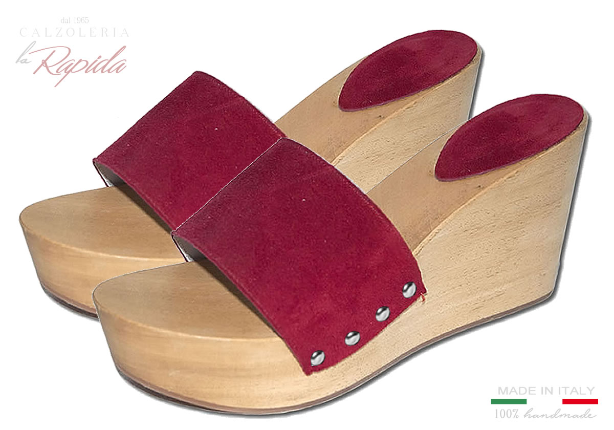 Materiale: Ciabatte con zeppa in legno alte, fascia in pelle camoscio rosso, personalizzabile in vari colori