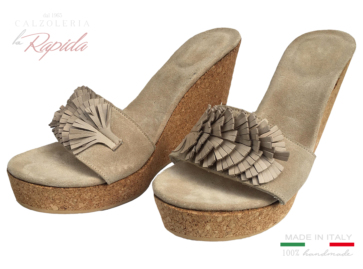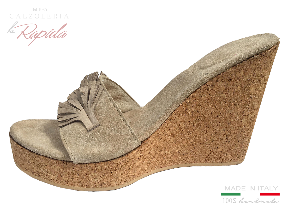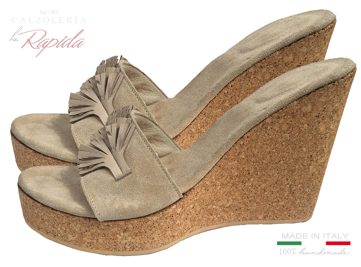 Materiale: Zeppa donna alta in completo sughero, fascia in pelle beige camoscio. Sulla pianta viene applicata la pelle imbottita per rendere il prodotto molto comodo.