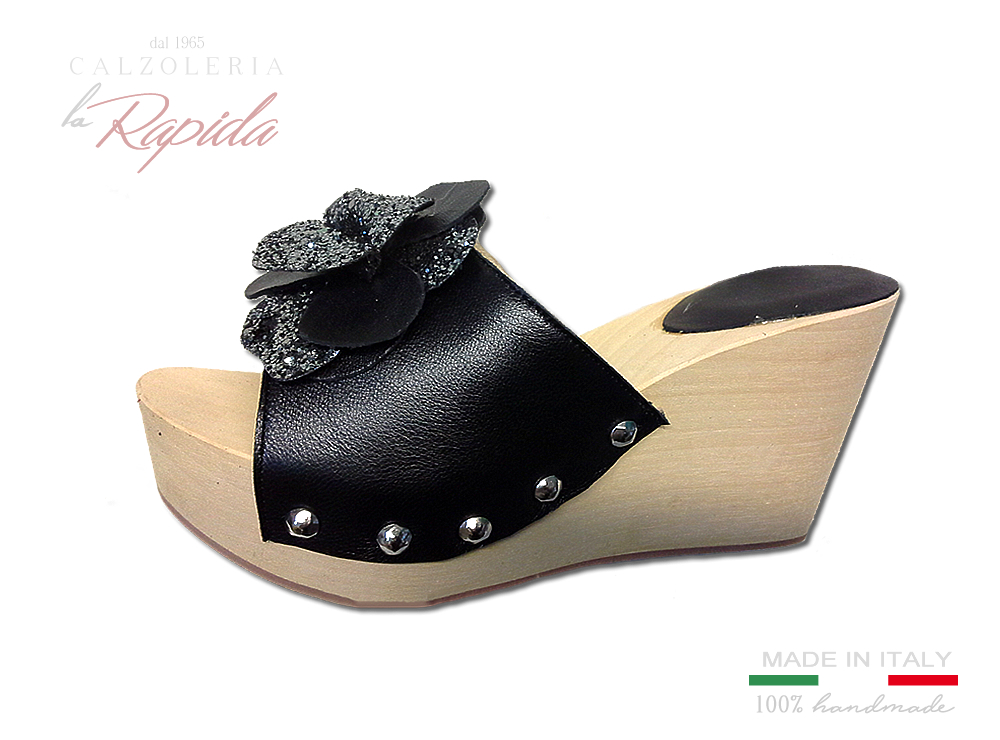 Descrizione: zeppe donna alte in legno leggero e restitente, con graziosa fascia in pelle nera con doecorazione in fiore realizzato a mano