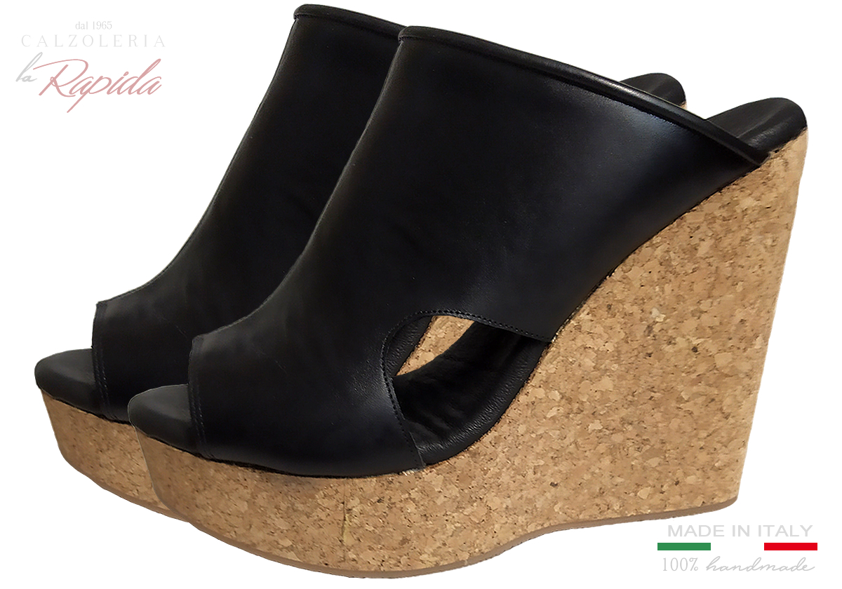Materiale: zeppe donna alte in completo in sughero, collezione primavera estate 2024, rivestita in pelle sulla pianta, tomaia in pelle naturale colore nera.