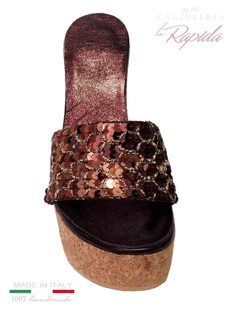 Materiale: Zeppa donna alta in completo fondo in sughero (no rivestimento), con fascia in pelle con fascia decorata bronzo e oro e rivestimento della pianta del piede in pelle.